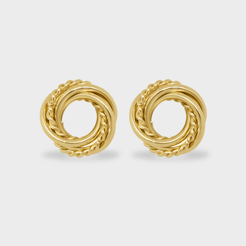 Estos aretes de chapa de oro de 18k presentan un diseño circular entrelazado que combina líneas lisas con detalles trenzados, evocando la forma de un nudo o lazo con volumen. Su estructura simétrica y acabado pulido los convierten en una pieza atemporal que aporta presencia sin esfuerzo, ideal para elevar desde looks casuales hasta atuendos más formales.