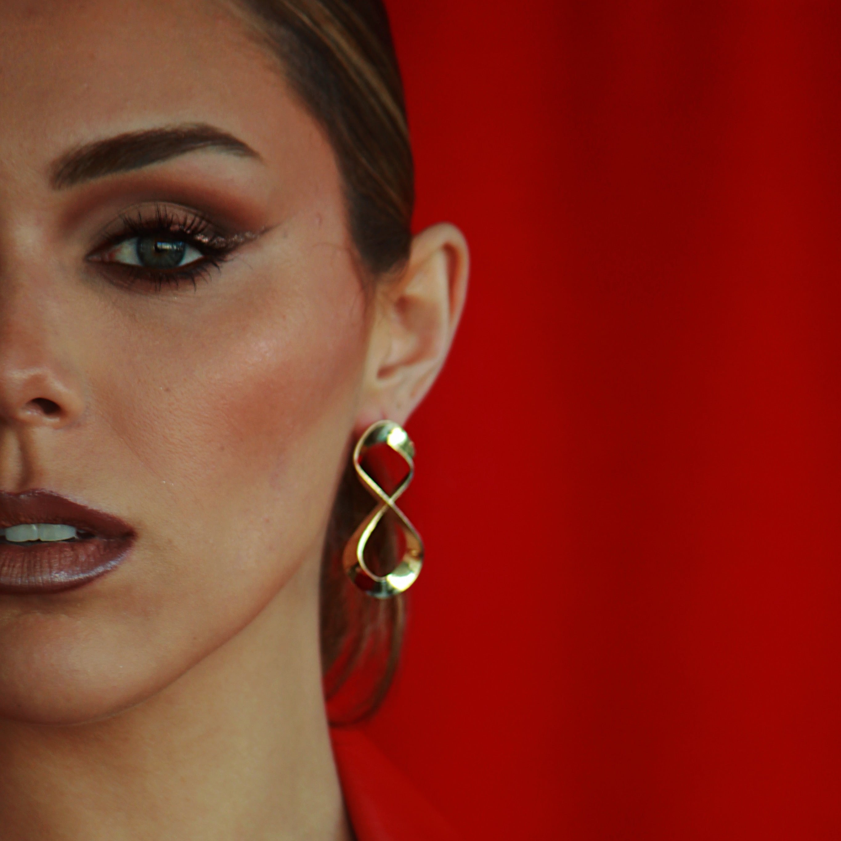Escultural y atemporal. Estos aretes de chapa de oro de 18k destacan por su diseño fluido en forma de infinito, con líneas suaves que se cruzan generando una silueta elegante y moderna. Su acabado pulido refleja la luz de forma sutil, convirtiéndolos en una pieza llamativa sin necesidad de brillos adicionales. Perfectos para looks sofisticados con un toque artístico.