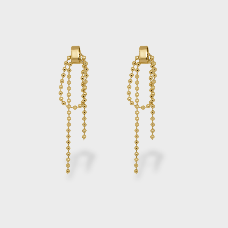 Delicadeza con movimiento. Estos aretes de chapa de oro de 18k están formados por cadenas finas de bolitas doradas que caen en distintos niveles, creando un efecto fluido y sofisticado. Su diseño liviano y dinámico aporta brillo sin esfuerzo, ideal para elevar tus looks con un toque moderno y femenino