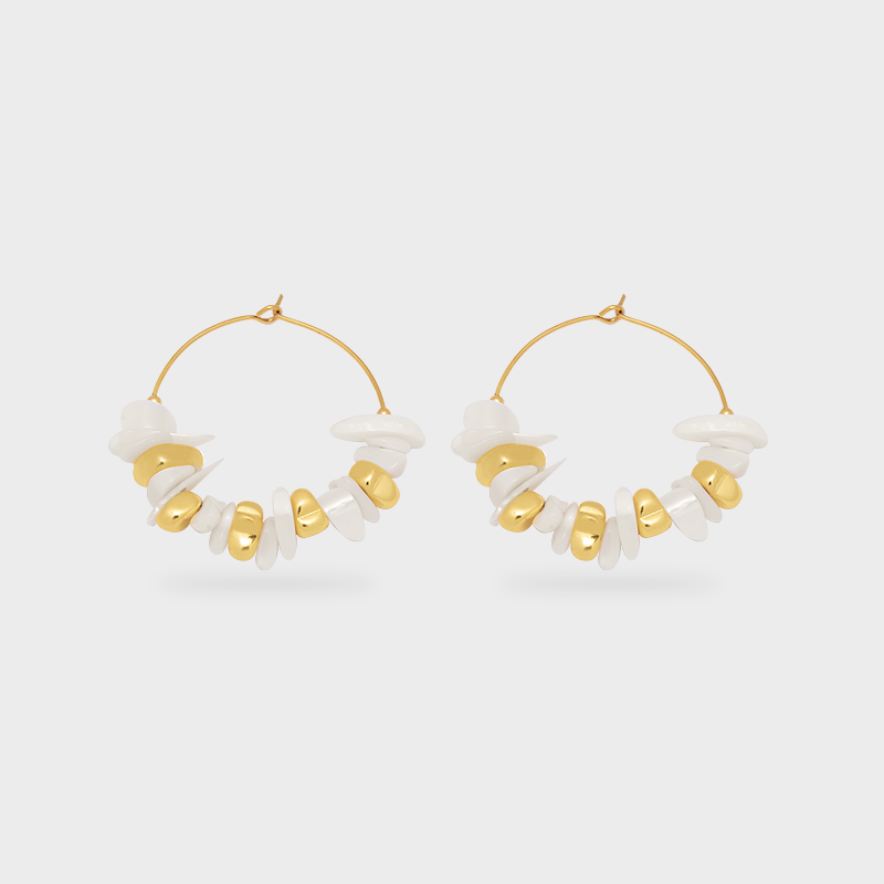 Texturas que evocan frescura y movimiento. Estas arracadas de acero inoxidable combinan cuentas blancas irregulares con acentos dorados metálicos, logrando un balance perfecto entre lo natural y lo moderno.