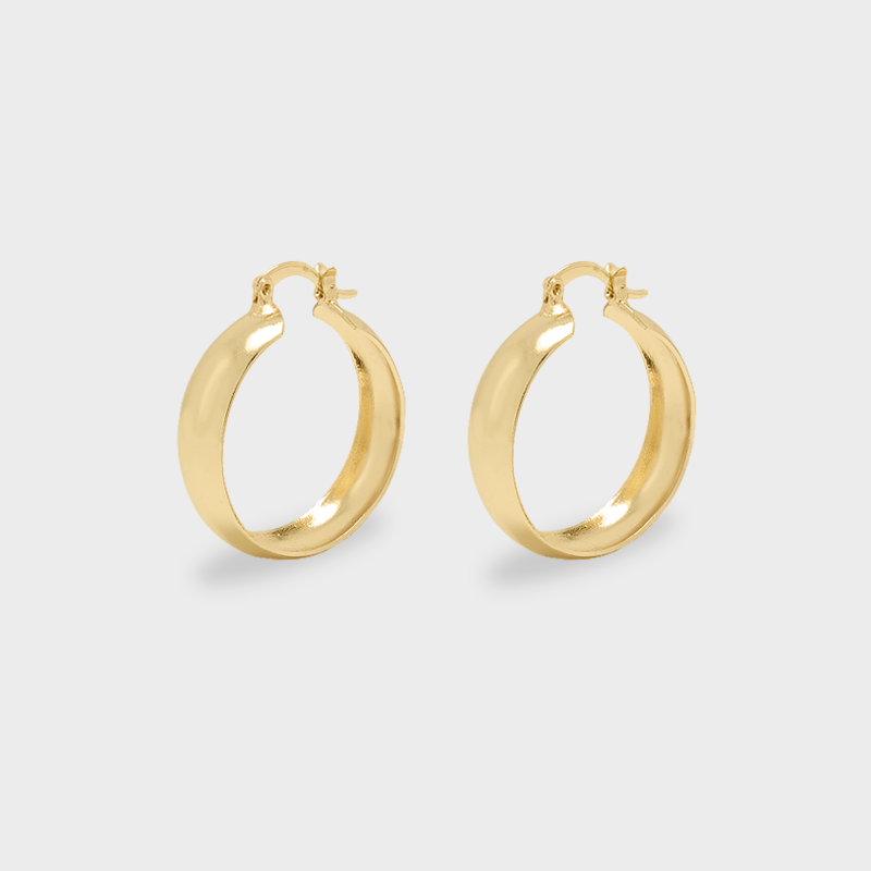 Un básico con presencia. Estas arracadas de chapa de oro destacan por su silueta ligeramente gruesa y su acabado pulido que refleja la luz con sutileza. Su diseño clásico las convierte en una pieza versátil, ideal para el día a día o para elevar cualquier look sin esfuerzo. Atemporales, cómodas y fáciles de combinar.