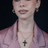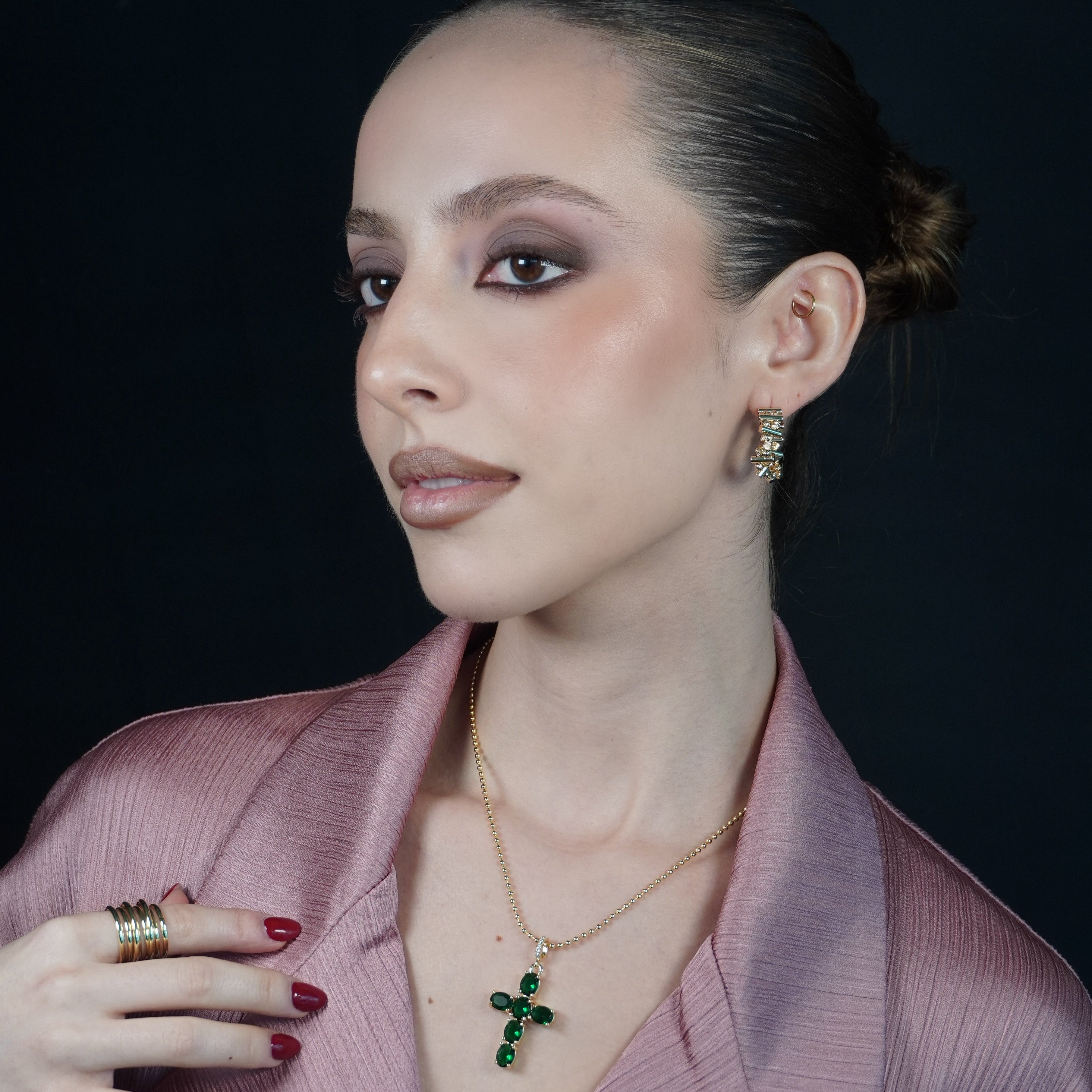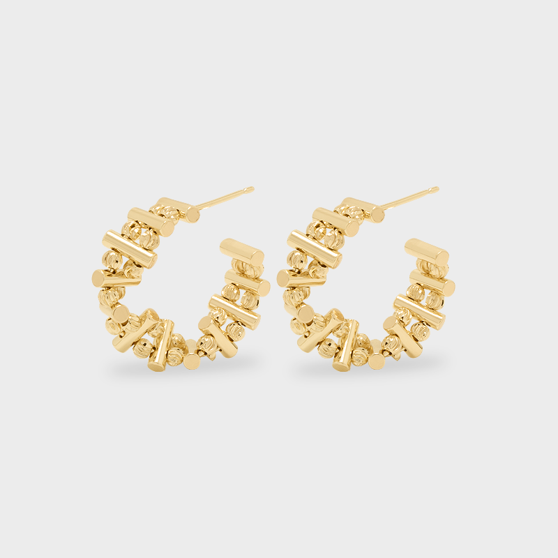 Estas arracadas de chapa de oro combinan pequeños elementos geométricos con un acabado pulido que aporta brillo y movimiento. Su diseño texturizado crea un efecto visual interesante sin dejar de ser elegante, ideal para darle un giro especial a looks neutros o elevar un outfit sencillo. Llamativas, modernas y con mucha personalidad.