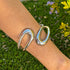 El brazalete Elipse en chapa plateada se distingue por su diseño abierto con formas orgánicas y pulidas que abrazan la muñeca con fluidez. Su estructura rígida y cómoda la convierte en una pieza fácil de llevar, perfecta para quienes buscan un estilo contemporáneo y sofisticado con un toque artístico.