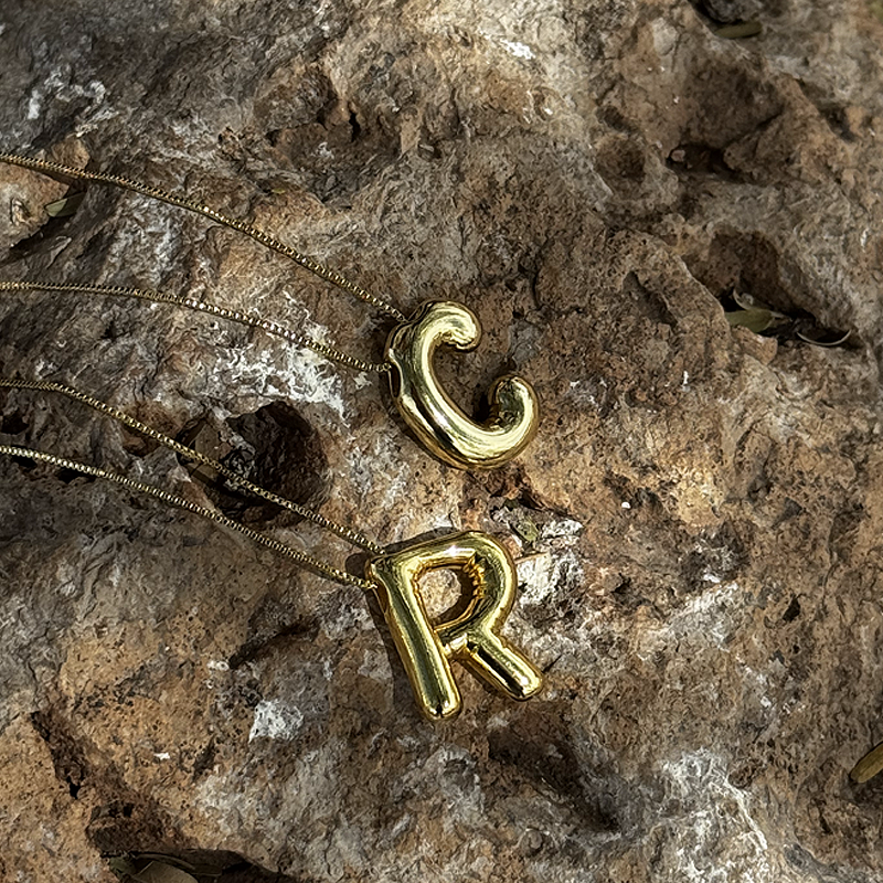 Una inicial con actitud. Esta cadena con bolitas de acero inoxidable sostiene un dije con volumen tipo globo hecho en chapa de oro, ideal para destacar tu estilo con un toque moderno y divertido.