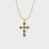Cadena tipo bolitas con dije en forma de cruz, decorado con circones azul zafiro enmarcados por un halo brillante. Su contraste entre el dorado y el azul profundo le da un aire gótico y sofisticado, ideal para quienes buscan una pieza con presencia y personalidad. Perfecto para elevar looks nocturnos o dar un toque de carácter a un outfit clásico.