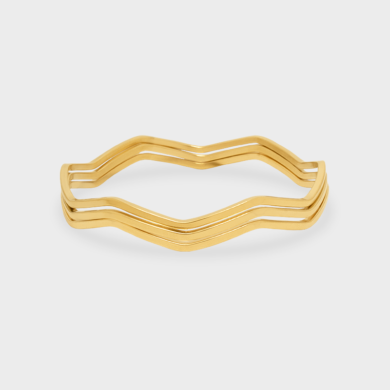 Diseño de líneas onduladas y limpias que aporta un toque moderno y sofisticado. Su estructura firme pero ligera la convierte en una pieza versátil que puedes llevar sola o combinada con otras. Fabricada en acero inoxidable, es resistente al agua, no se oxida y mantiene su brillo impecable con el paso del tiempo.