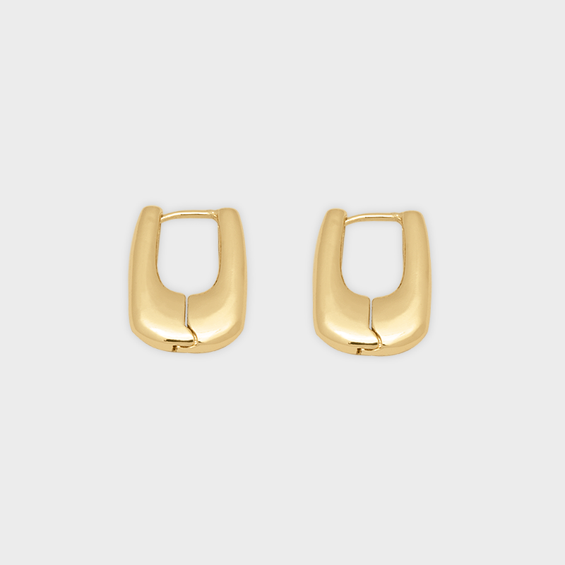 Estos huggies de chapa de oro presentan una forma rectangular suavemente redondeada que aporta un look moderno y minimalista. Su acabado pulido y su volumen equilibrado las convierten en un básico con presencia, perfectos para el diario o para complementar looks más sofisticados.