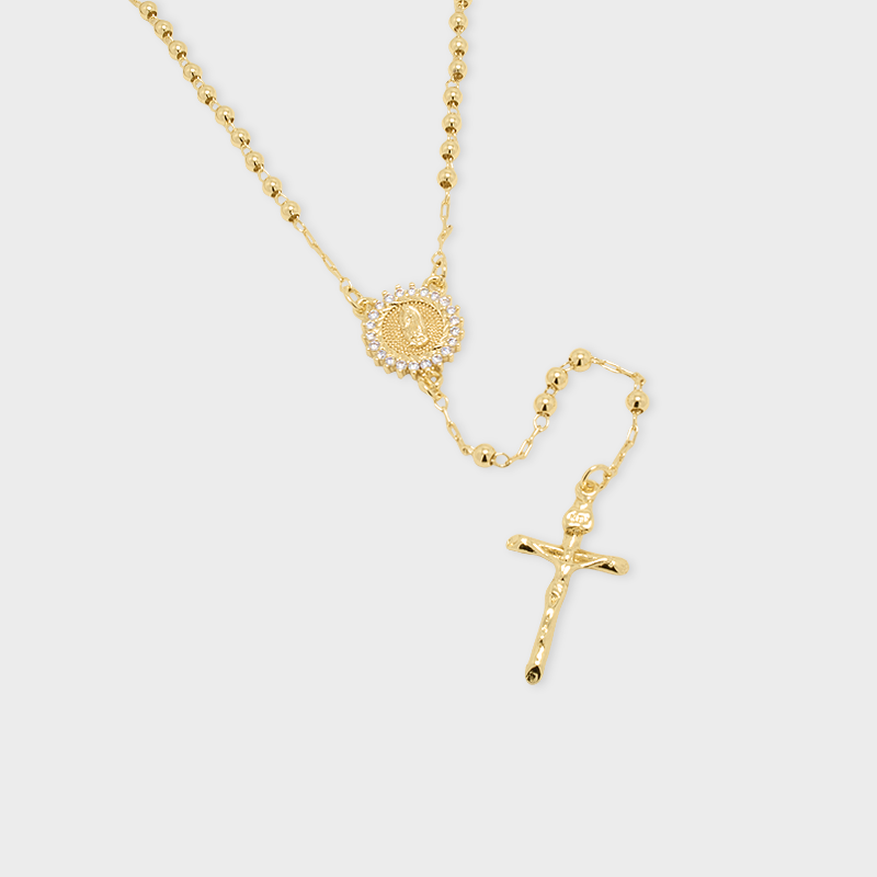 Un rosario elegante elaborado en chapa de oro, con cuentas esféricas que aportan un brillo clásico y un dije central con circones que enmarcan la medalla, añadiendo un toque sofisticado. Terminado con cruz detallada, es una pieza significativa que combina devoción y estilo atemporal.